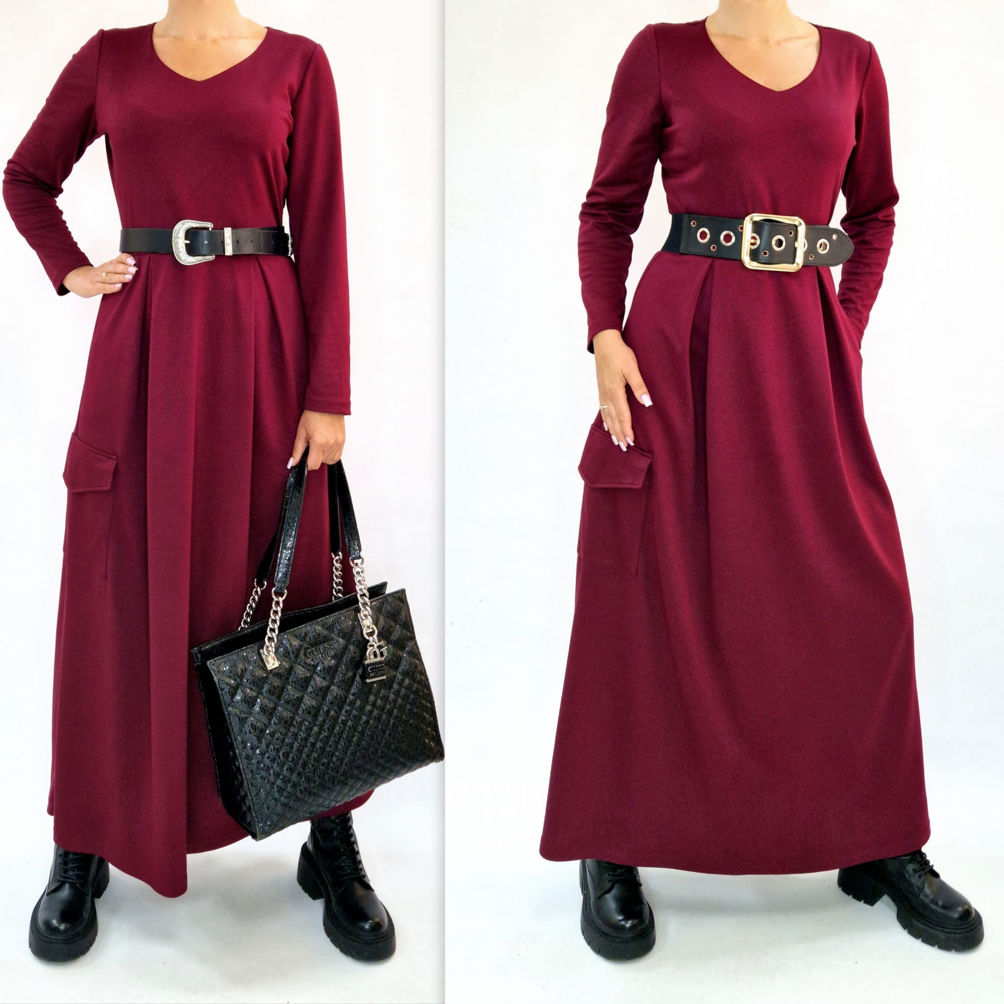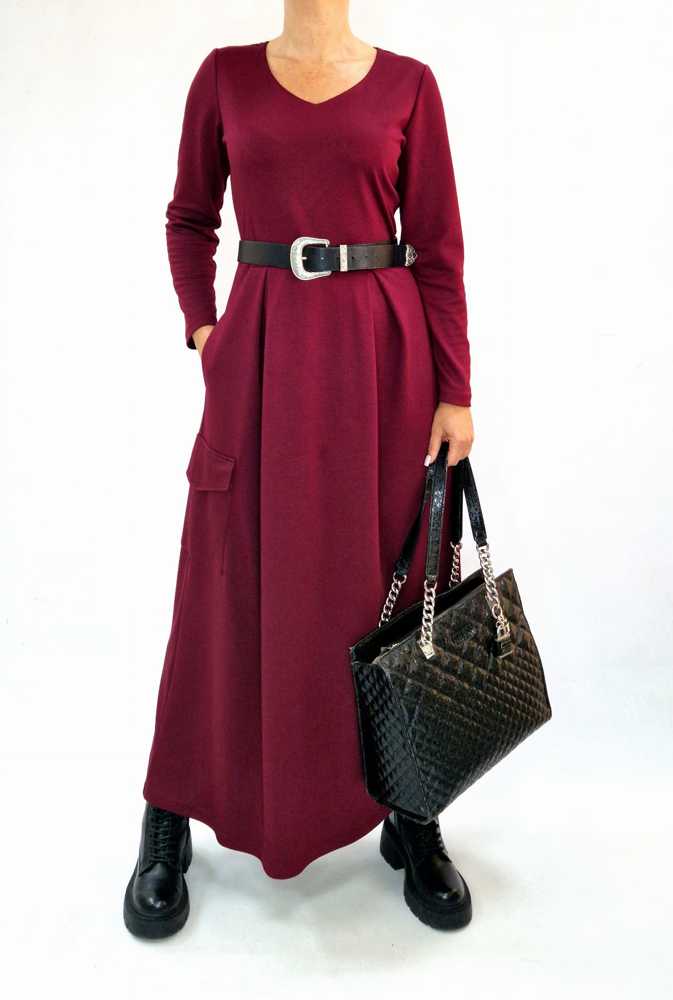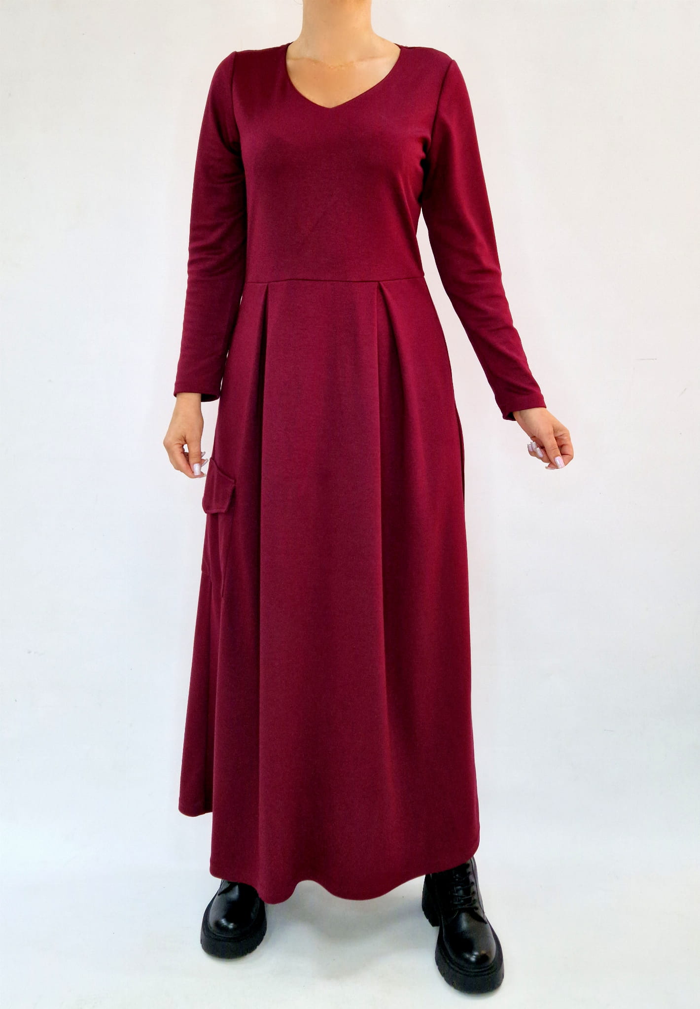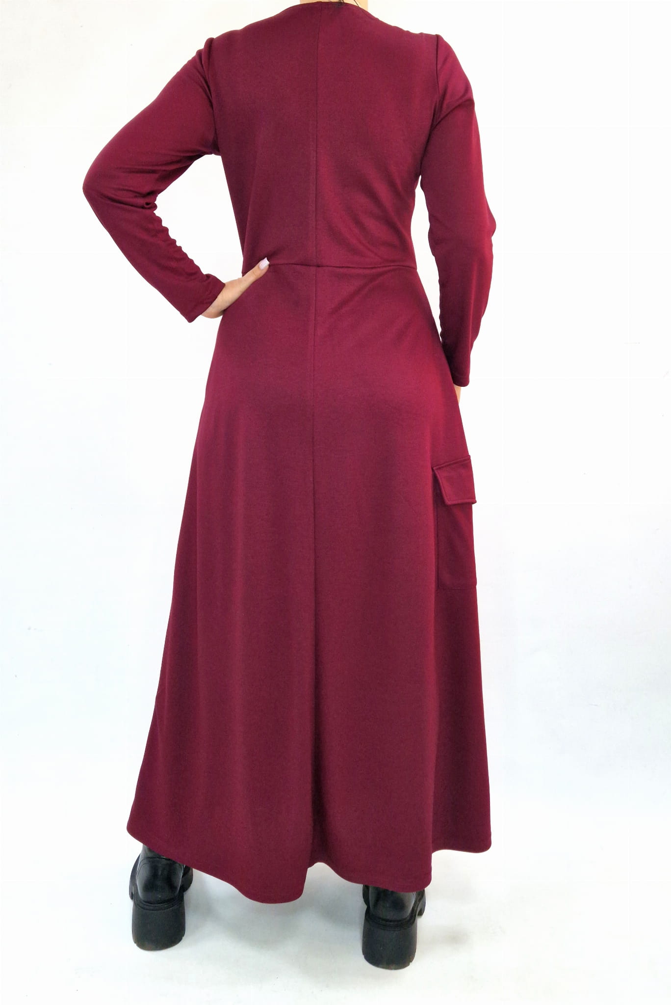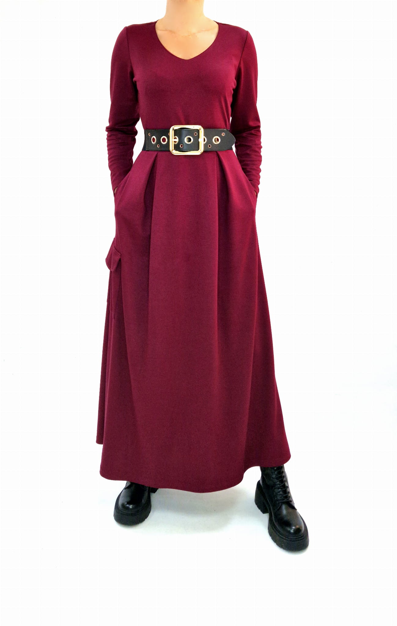 Bordowa długa sukienka z kieszeniami r. 36-56