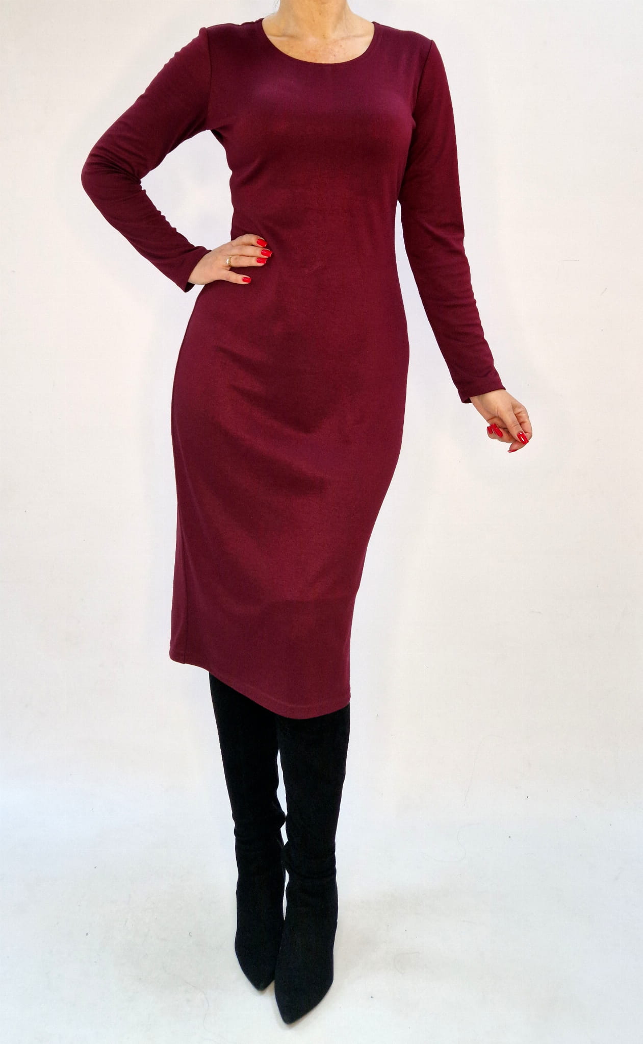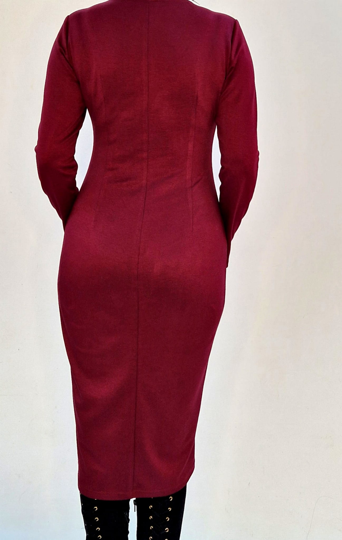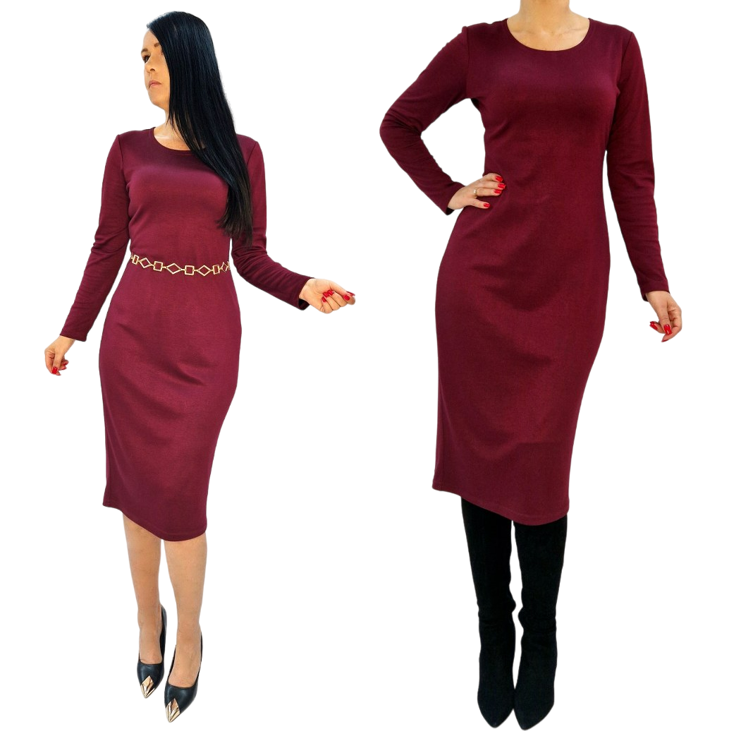 BORDOWA DOPASOWANA SUKIENKA MIDI Z DŁUGIM RĘKAWEM