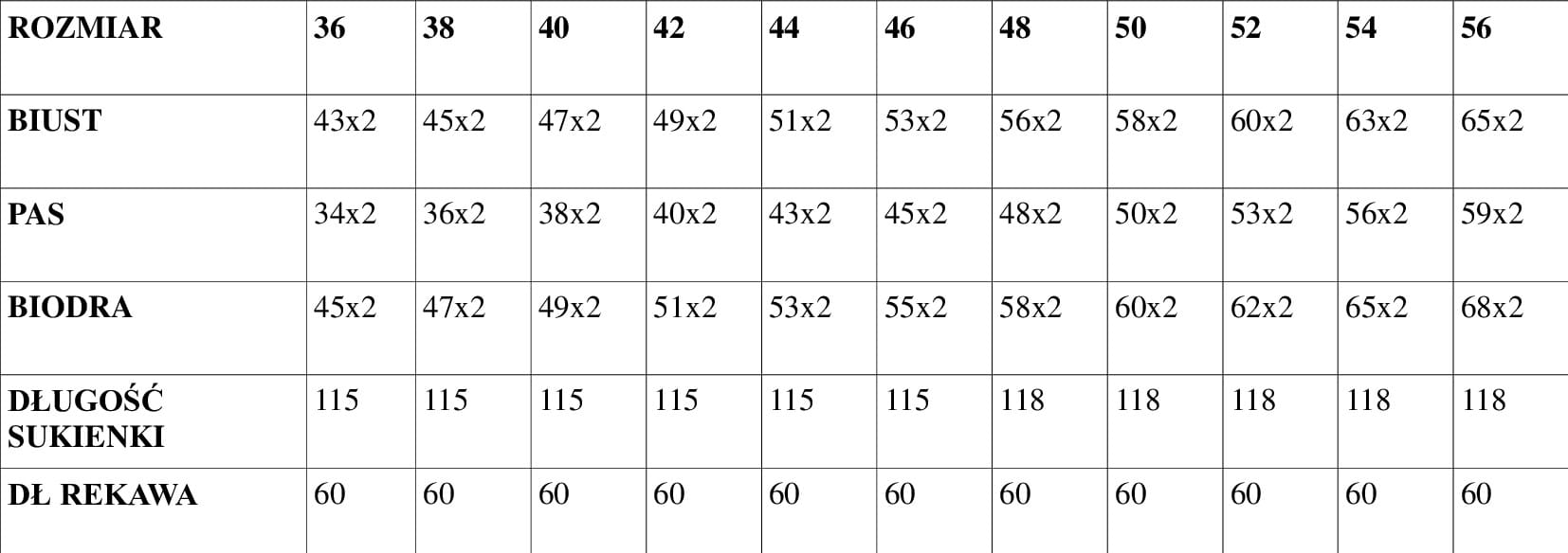 TABELA PRZEDSTAWIA WYMIARY SUKIENKI BEZ ROZCIAGANIA