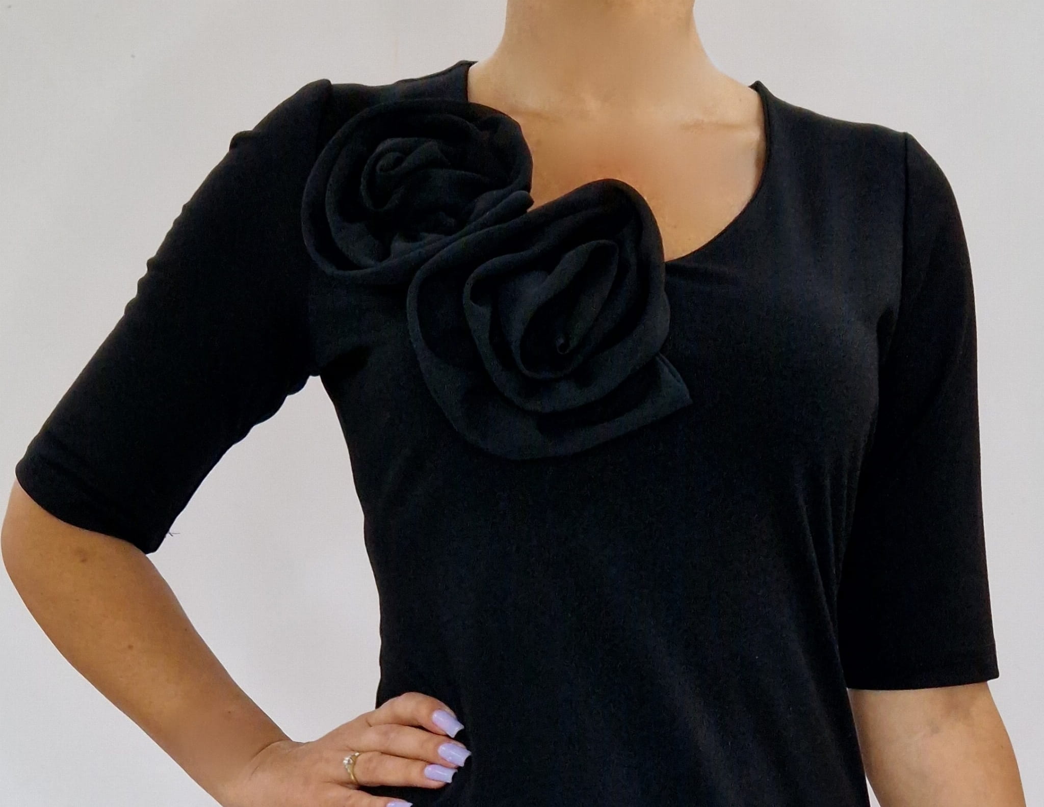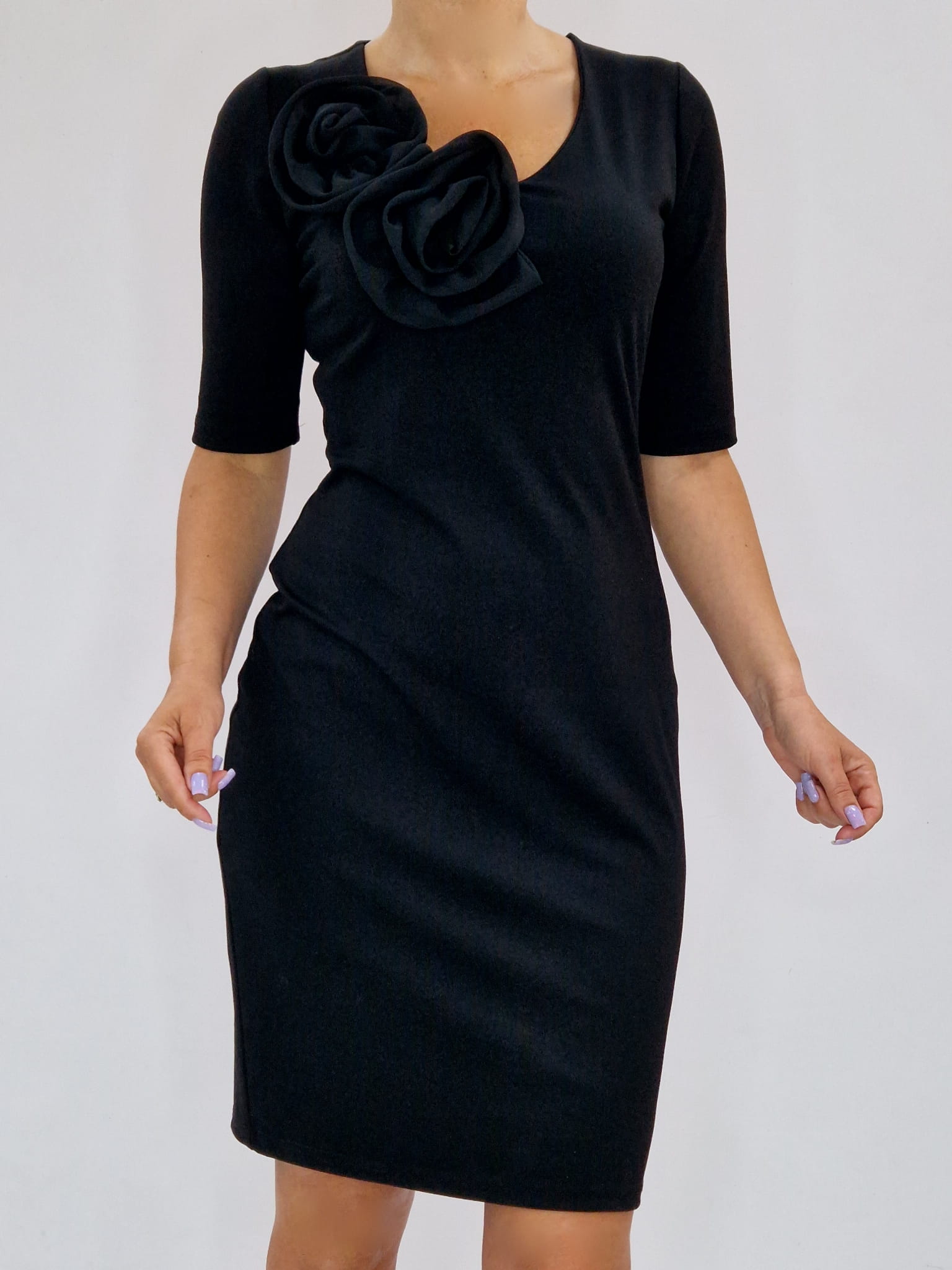 ELEGANCKA CZARNA SUKIENKA Z OZDOBNĄ APLIKACJĄ W POSTACI RÓŻ Z SZYFONU