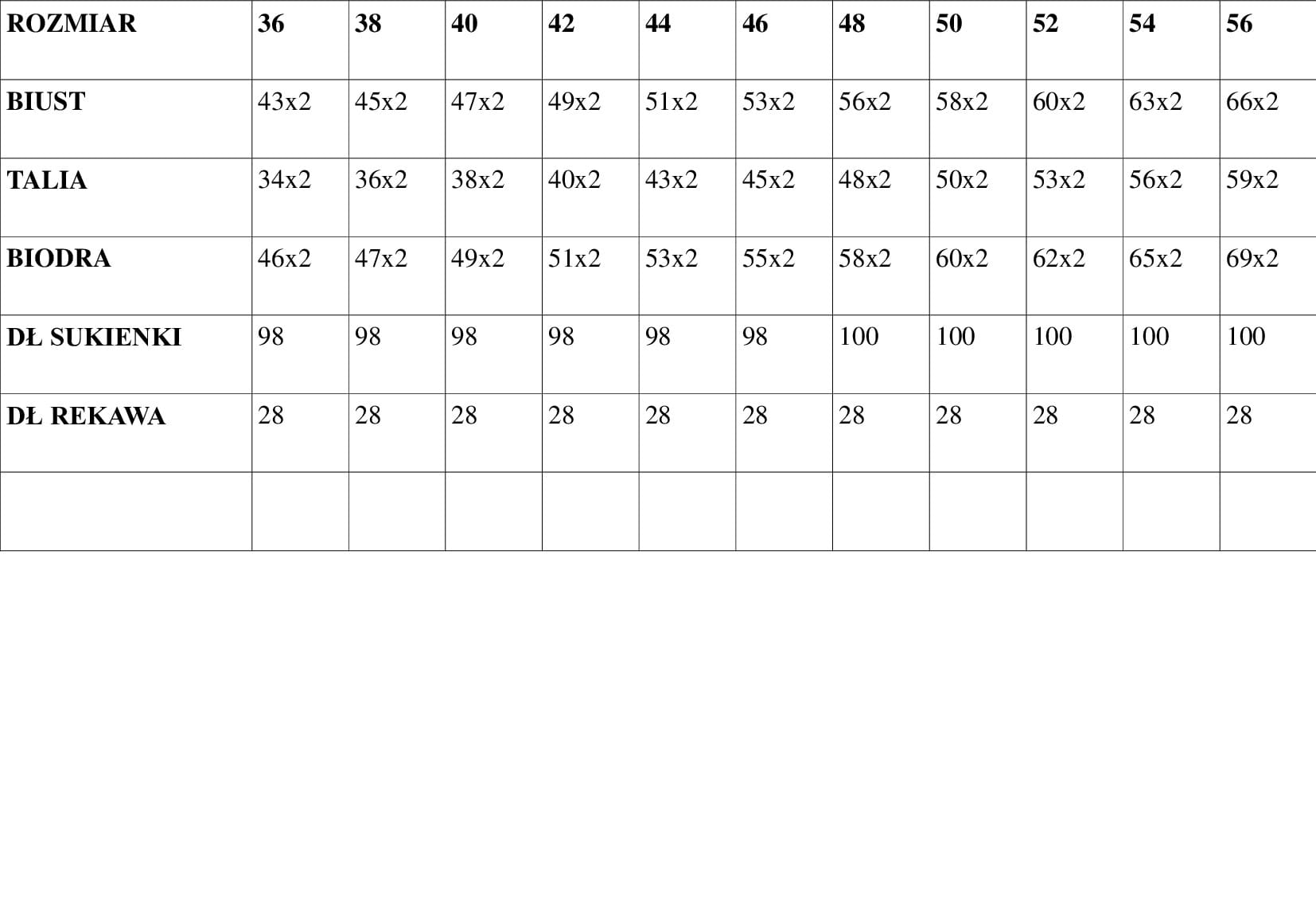 - TABELA PRZEDSTAWIA WYMIARY SUKIENKI (NIE SĄ TO WYMIARY SYLWETKI)