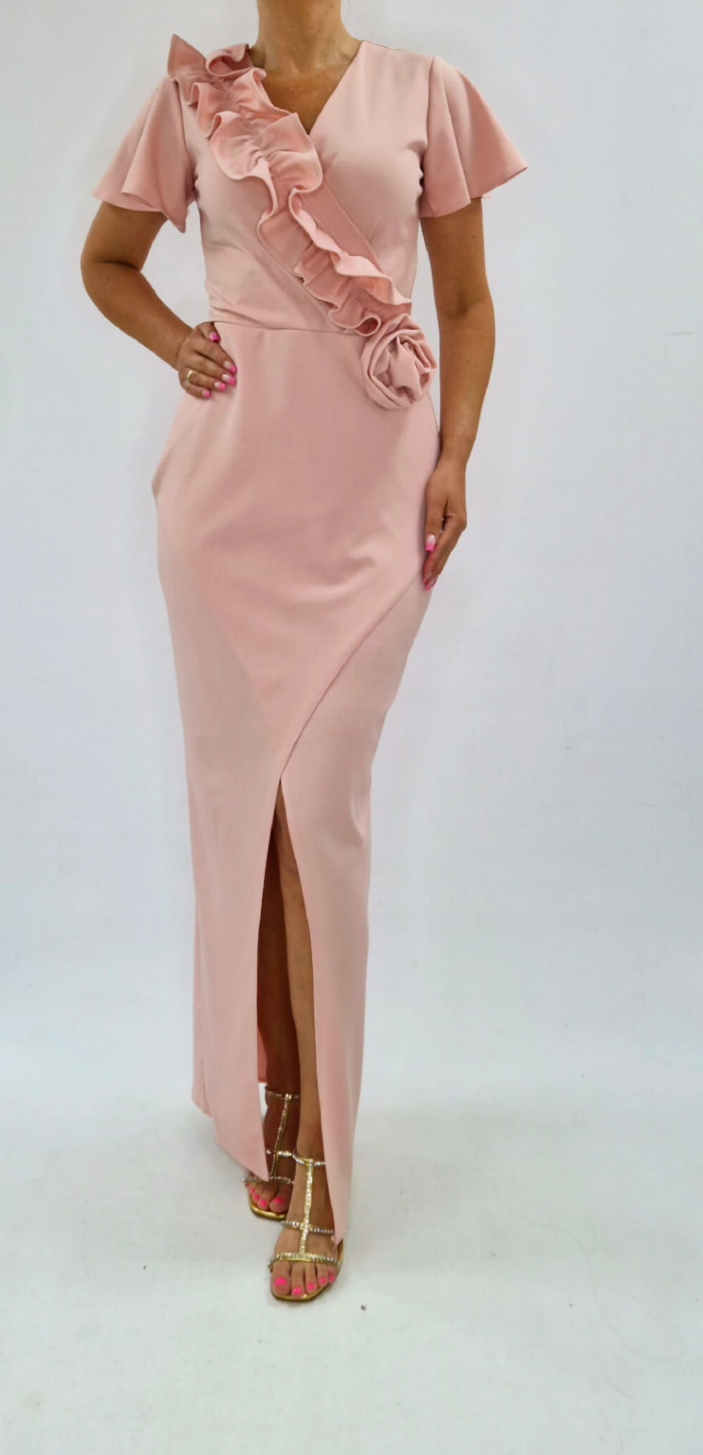 Elegancka koktajlowa sukienka maxi kopertowa draperia róża 36-56