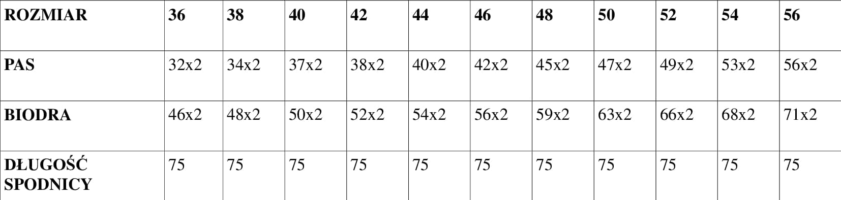 TABELE PRZEDSTAWIA WYMIARY SPÓDNICY I BLUZKI BEZ ROZCIAGANIA