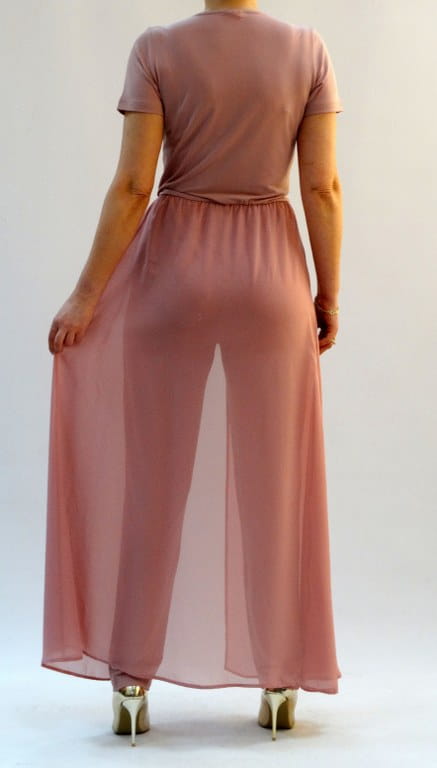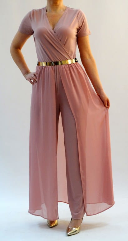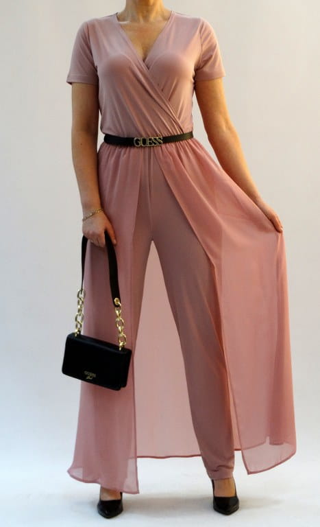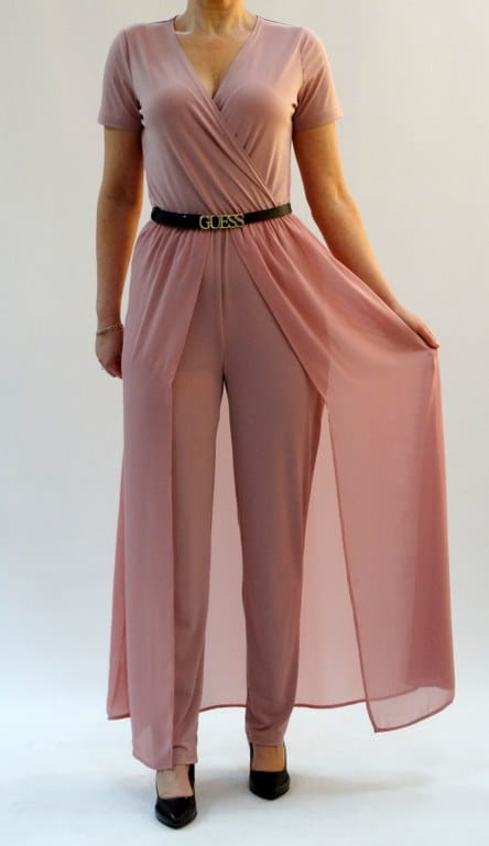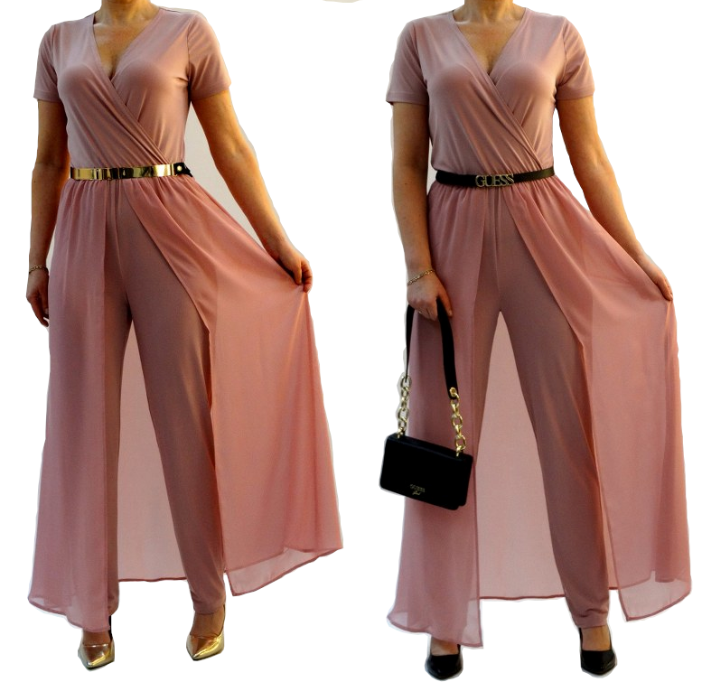 Elegancki różowy kombinezon z szyfonowym trenem (34-56)