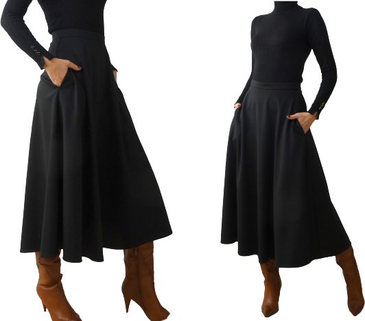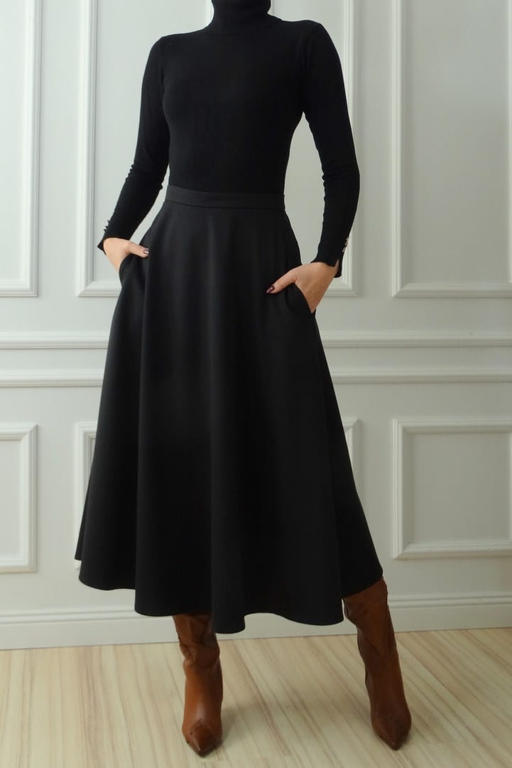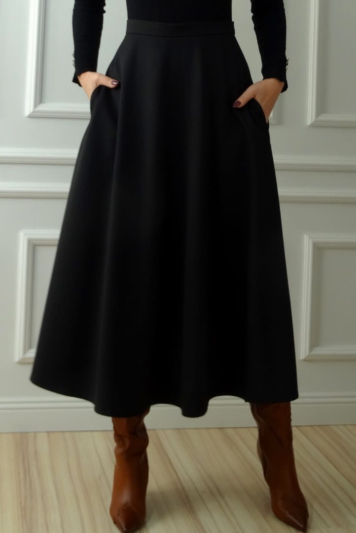 Czarna spódnica o długości midi zaprojektowana i uszyta przez naszą firmę w Polsce.