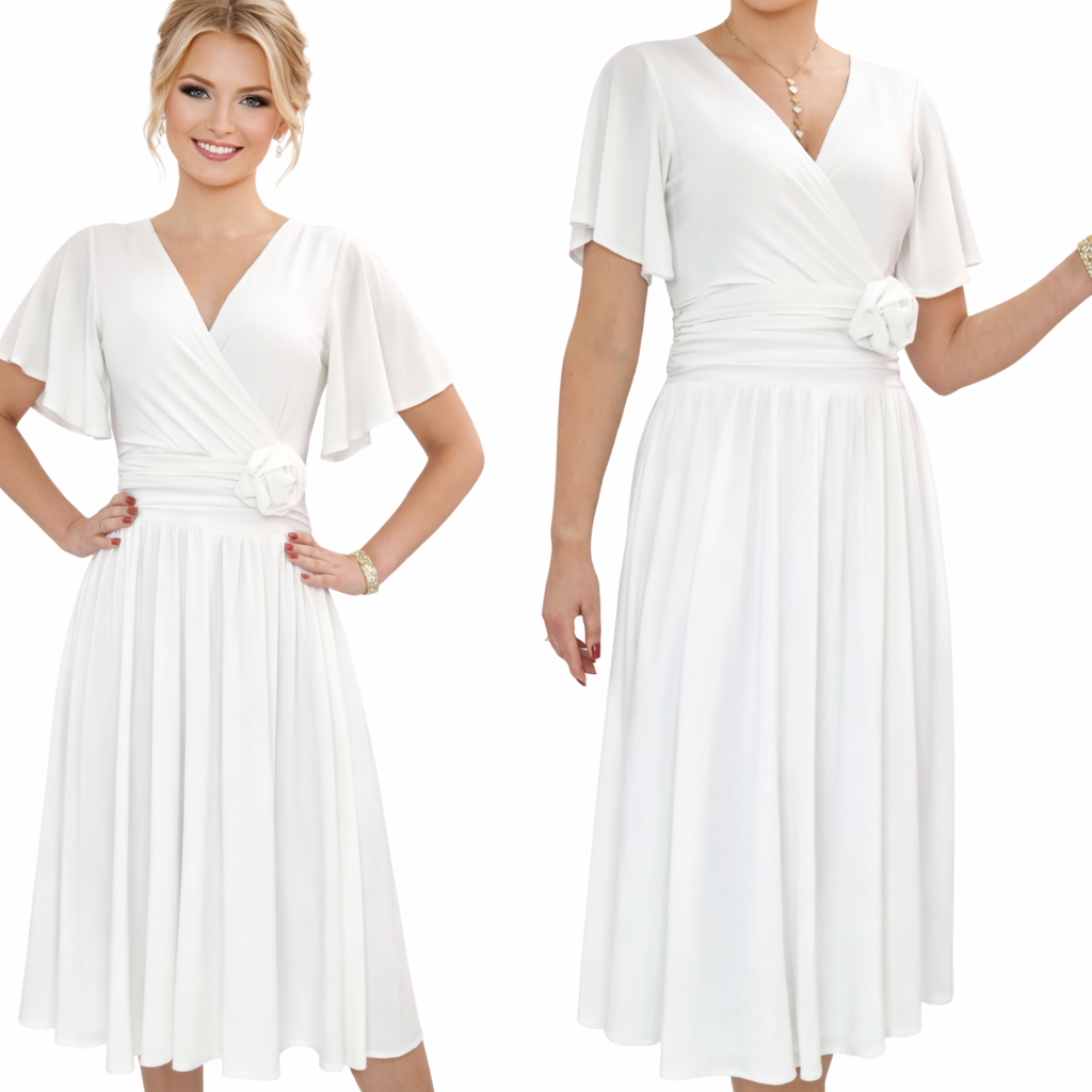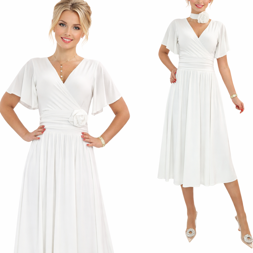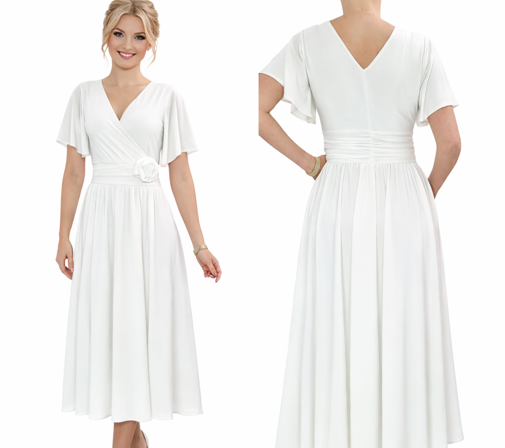 Model o kopertowym kroju pięknie podkreśla biust i talię, a lekko rozkloszowany dół nadaje sylwetce lekkości i elegancji. Zwiewne rękawy typu motylek dodają subtelności i zapewniają komfort noszenia.