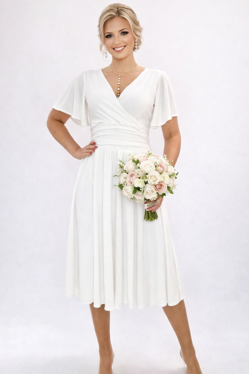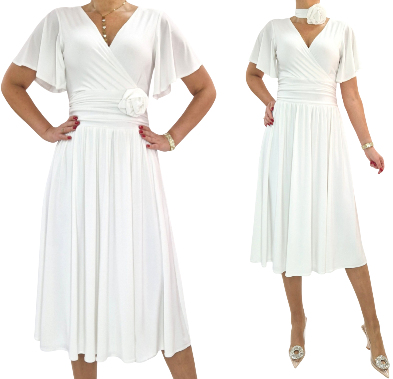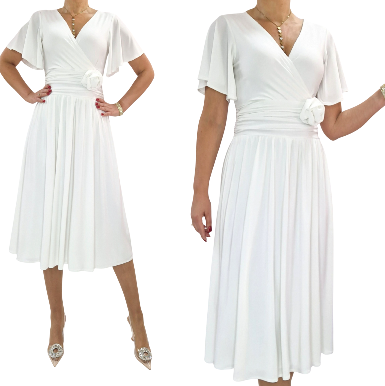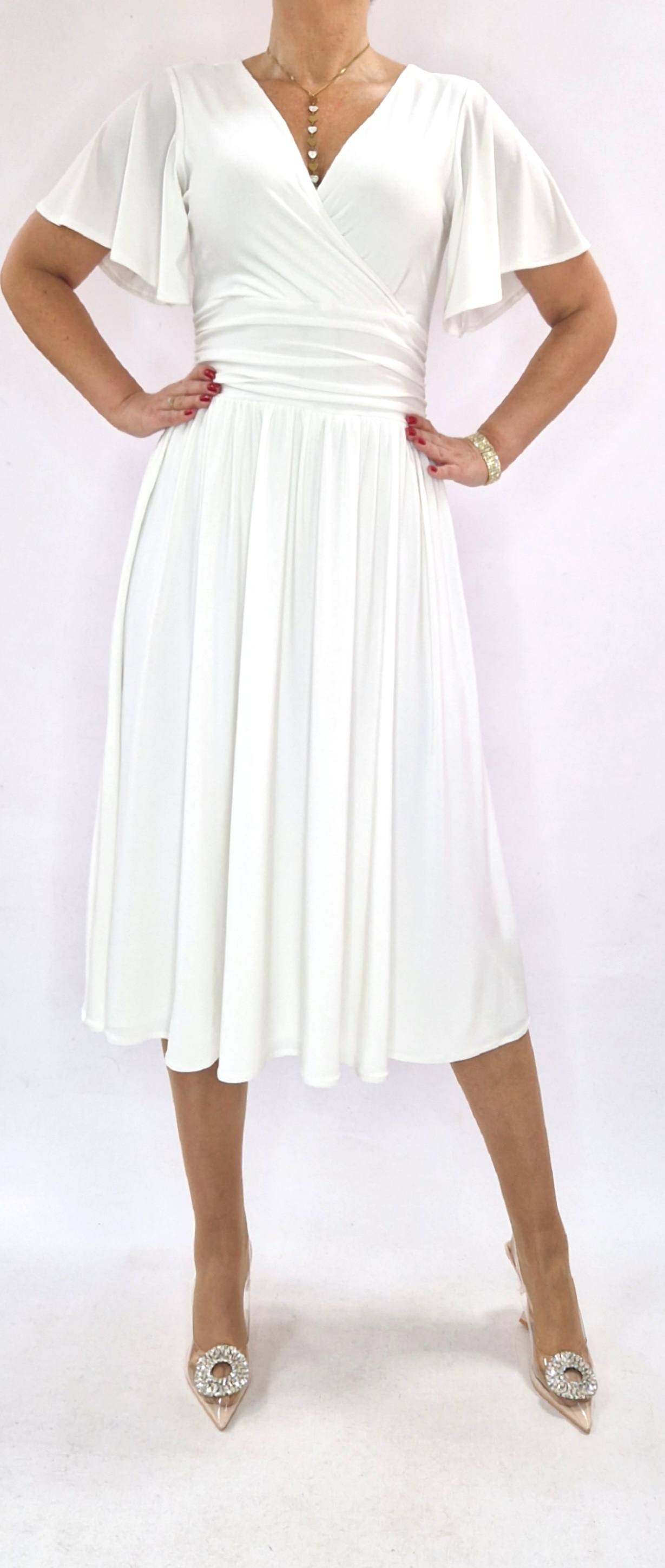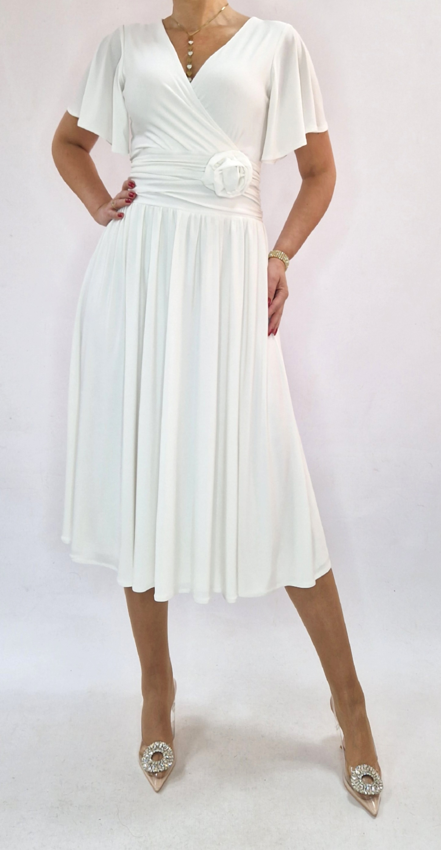 Sukienka midi jasny krem elegancka kopertowa rękaw motylek roz 34-56