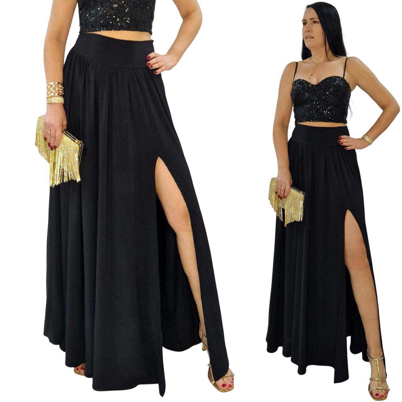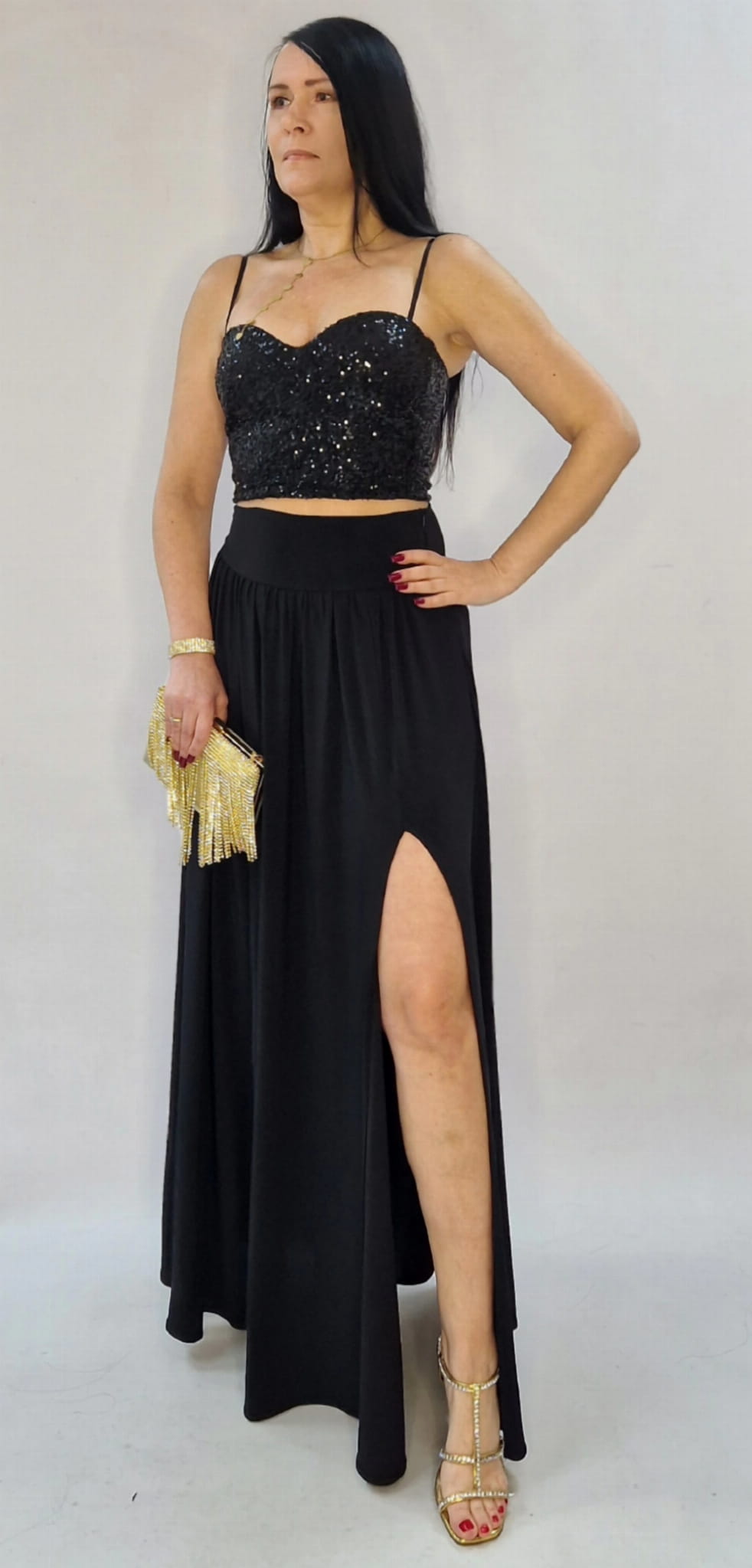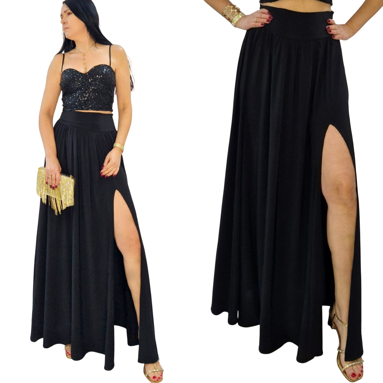 Elegancka czarna spódnica maxi z rozcięciem — idealna na sylwestra, studniówkę i wyjątkowe okazje