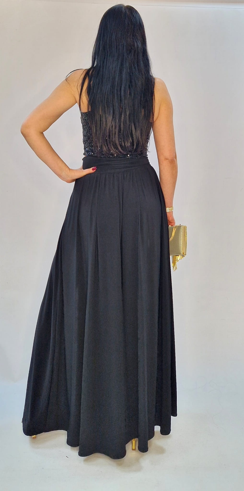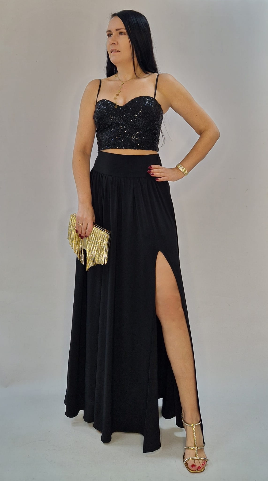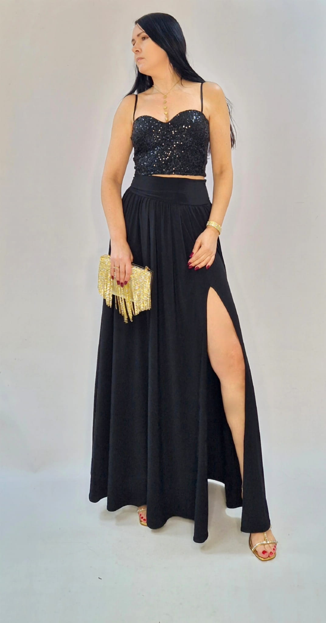 Elegancka czarna spódnica maxi z rozcięciem — idealna na sylwestra, studniówkę i wyjątkowe okazje