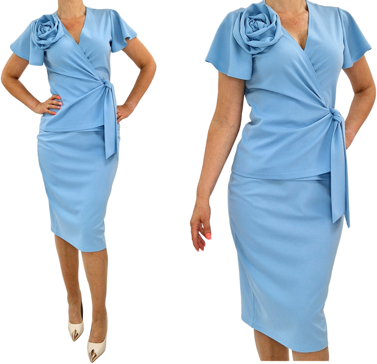 Wizytowy błękitny komplet bluzka i spódnica midi kwiat 3D roz36-56