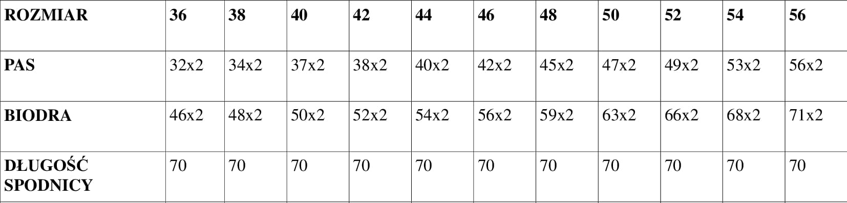 TABELA PRZEDSTAWIA WYMIARY SPÓDNICY BEZ ROZCIAGANIA